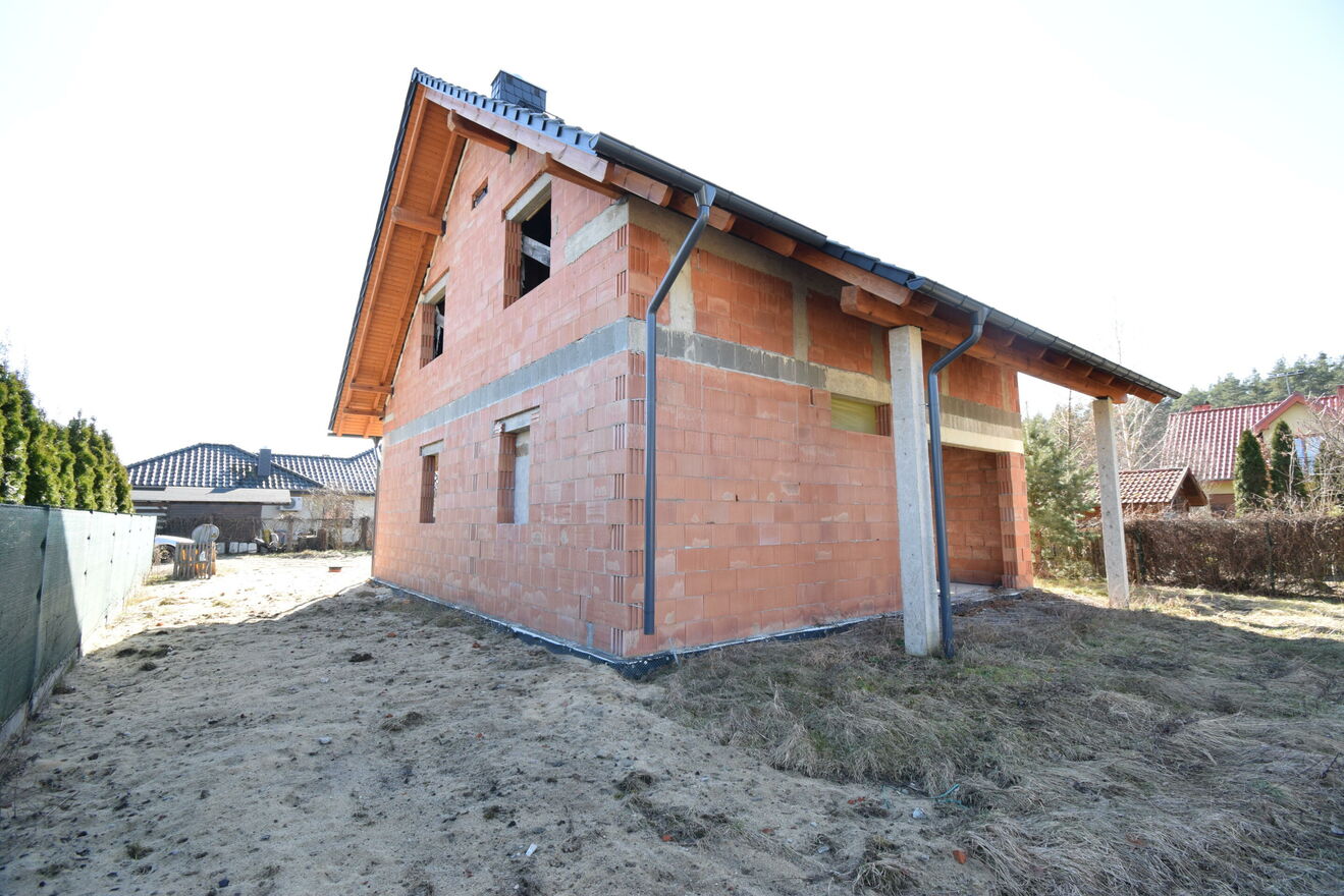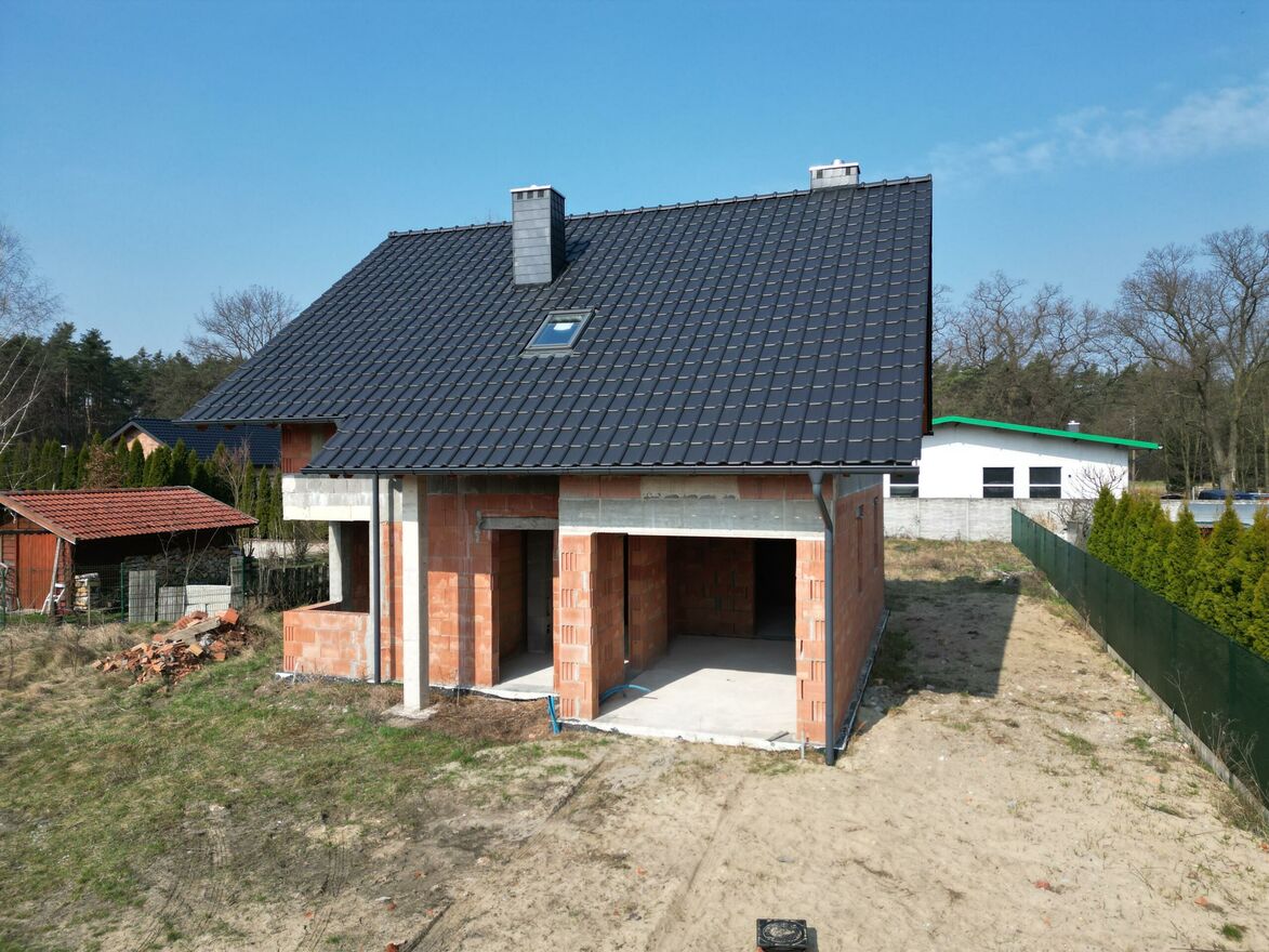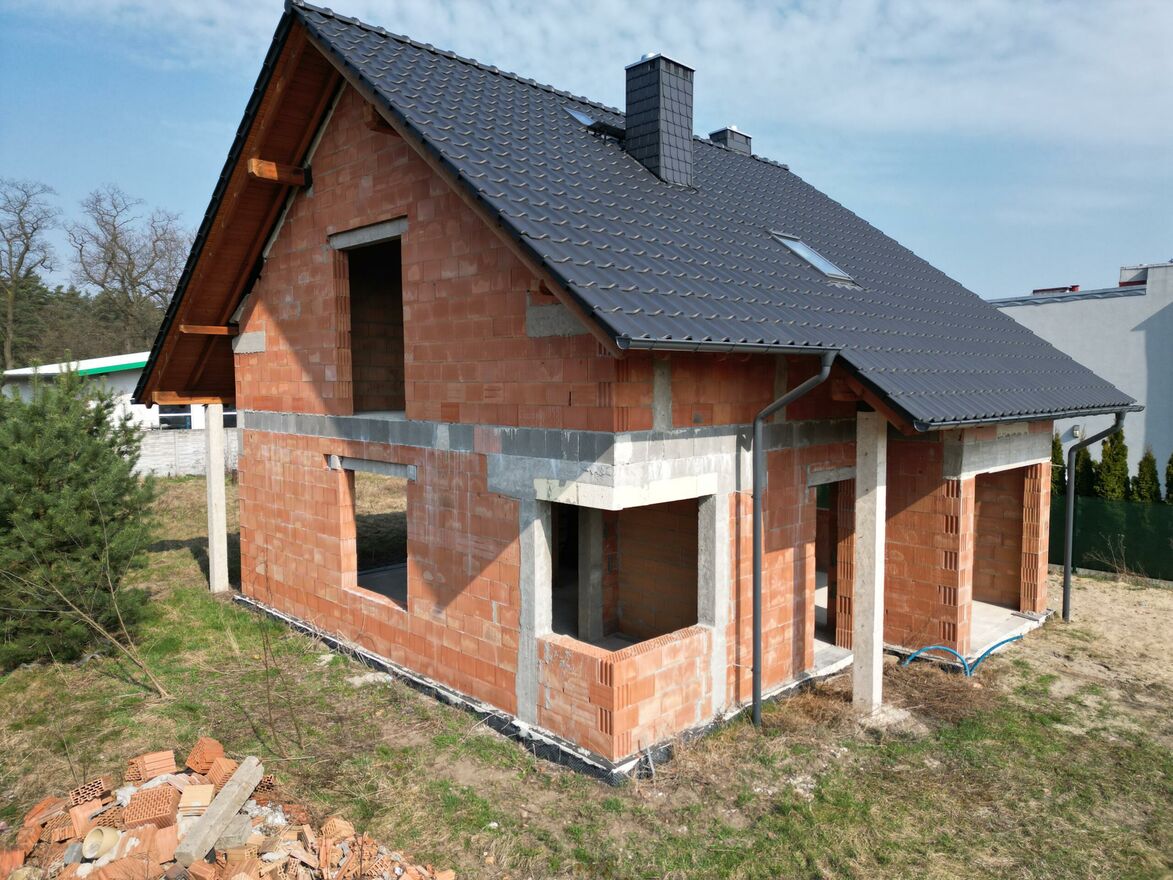 stan surowy otwarty wykonany dach pokryty dachówką, zamontowane okna dachowe, wykonane kominy, garaż w bryle budynku